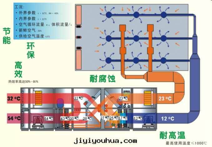 节(jié)能(néng)效益好(hǎo),由(yóu)于(yú)采用(yòng)耐腐蝕或(huò)不(bù)鏽钢等材料,气(qì)—气(qì)換热(rè)器热(rè)效率高(gāo)达(dá)50%~80%,最(zuì)高(gāo)使用(yòng)温度(dù)可(kě)达(dá)1000℃。