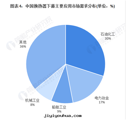 中(zhōng)國(guó)換热(rè)器産業主(zhǔ)要(yào)集中(zhōng)于(yú)石(dàn)油、化(huà)工、冶金(jīn)、電(diàn)力、船舶、集中(zhōng)供暖等領域。其(qí)中(zhōng),石(dàn)油、化(huà)工行業是(shì)換热(rè)器最(zuì)主(zhǔ)要(yào)的(de)應(yìng)用(yòng)領域,約占換热(rè)器30%的(de)市场(chǎng)份額。石(dàn)油、化(huà)工生(shēng)産中(zhōng)幾(jǐ)乎所(suǒ)有(yǒu)的(de)工藝过(guò)程都有(yǒu)加热(rè)、冷(lěng)卻或(huò)冷(lěng)凝过(guò)程,都需要(yào)用(yòng)到(dào)換热(rè)器。電(diàn)力和(hé)冶金(jīn)两(liǎng)大行業所(suǒ)需的(de)換热(rè)器約占換热(rè)器市场(chǎng)17%的(de)份額。船舶行業應(yìng)用(yòng)大量(liàng)的(de)中(zhōng)央冷(lěng)卻器等換热(rè)設備,約占換热(rè)器行業9%的(de)市场(chǎng)份額;機(jī)械行業在(zài)汽車、工程機(jī)械、農業機(jī)械中(zhōng)應(yìng)用(yòng)大量(liàng)的(de)機(jī)油冷(lěng)卻器、中(zhōng)冷(lěng)器等換热(rè)器,約占換热(rè)器行業8%的(de)市场(chǎng)份額。此(cǐ)外(wài),在(zài)食品、醫药等領域,換热(rè)器市场(chǎng)需求也(yě)較大。